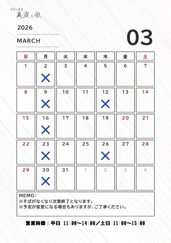 2026年3月美波乃風営業予定